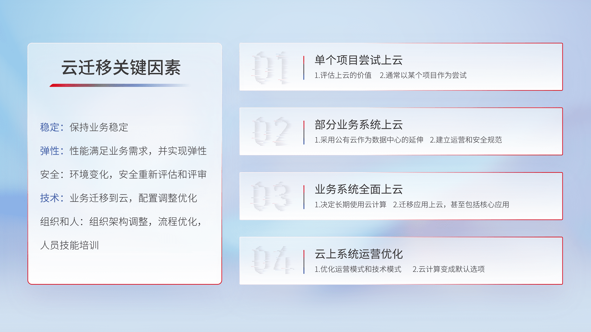 结合实际业务,,从规划设计、、、云平台选型、、、云原生改造、、、、数据迁移、、、集成交付,,,迁移全过程为客户识别最佳上云路径,,,做好风险识别管理,,,设计网络架构、、、、身份权限、、安全审计合规、、、、操作审计、、、日志审计、、监控告警策略、、、多站点容灾设计等,,,对云上基础设施进行整体规划,,,,提升IT治理水平,,以满足弹性、、、、高可用、、高性能的需求。。。。