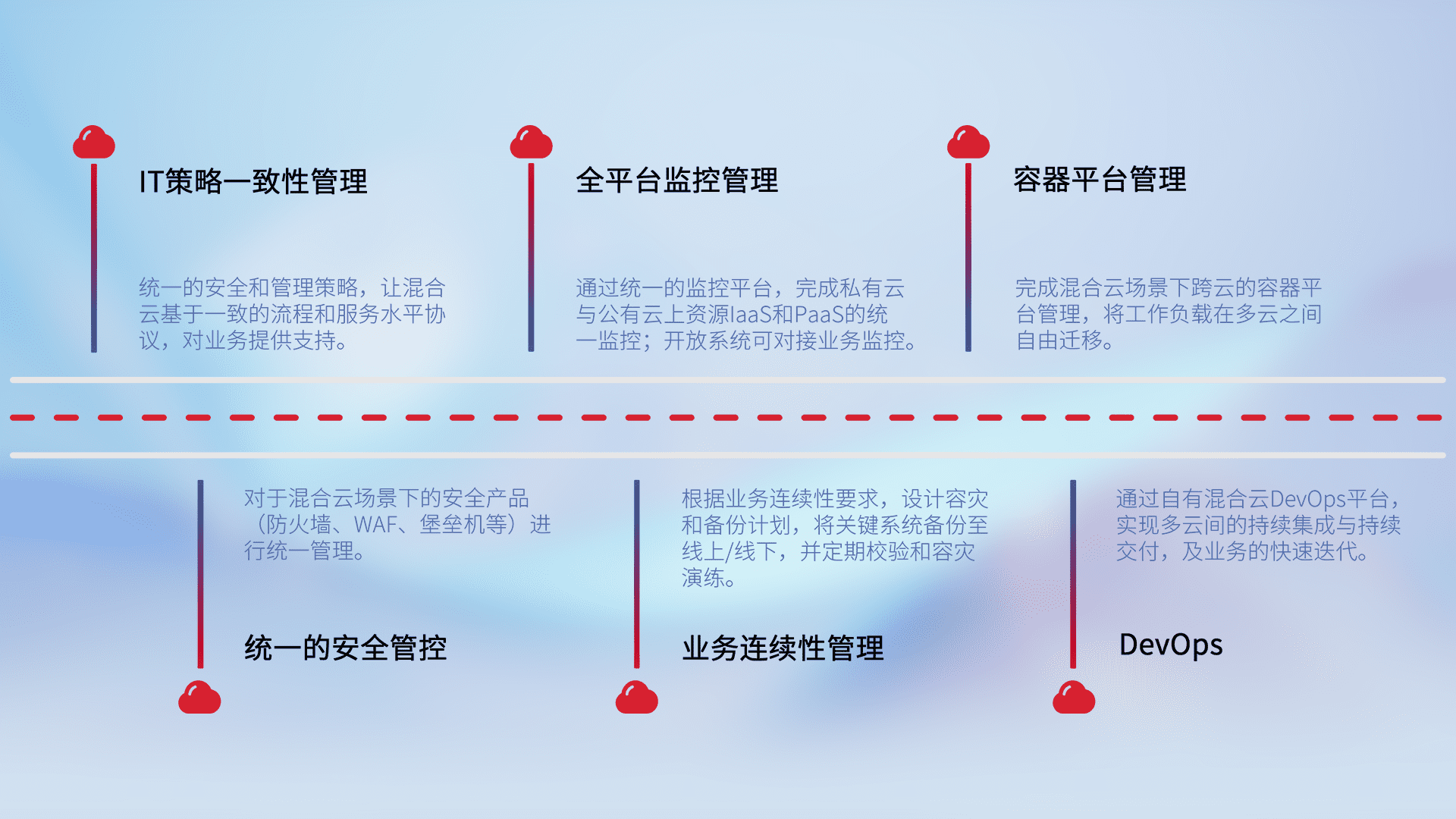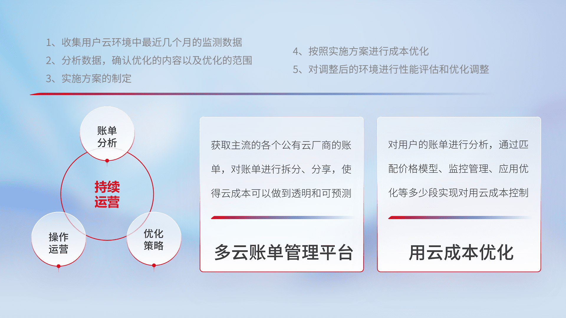 通过多云纳管,,,,以统一的资源数据模型把客户的云资源进行抽象和封装,,,,进而实现对多云资源的统一操作,,,,保障云资源管理的可靠性、、、稳定性与可用性。。。量身定制化运维内容,,配置、、开发运维、、、、补丁管理、、备份、、、监控、、认证和访问管理、、、审计和日常巡检等,,保障在用云过程中的可靠度,,,,稳定度以及高可用率。。