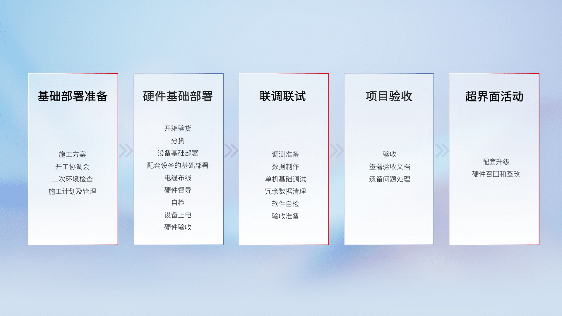 从基础部署准备、、、硬件基础部署、、、、联调联试、、项目验收、、、、越界面活动的全过程可追溯,,,,保证施工质量和进度。。。。